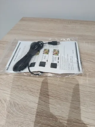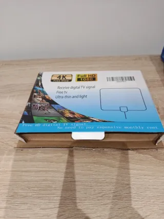 Antena de TV digital para interiores, diseñada para captar señales HD. - Diseño plano y discreto. - Incluye cable y adaptador para TV. - Soporta 1080p y 4K.