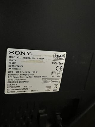 Televisor LCD Sony modelo KDL-47W805A. - Fabricado en Eslovaquia. - Voltaje: 220 V - 240 V. - Frecuencia: 50 Hz. - Consumo: 139 W. - Fabricante: Sony Corporation. - Fecha de fabricación: 01/2014.