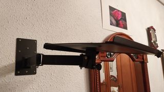 Soporte de pared para televisión o monitor. - Color negro. - Regulable con distintas posiciones. -Brazo movil. - Base metálica para fijación. - Diseño con soporte central. - Ranuras para ajuste.