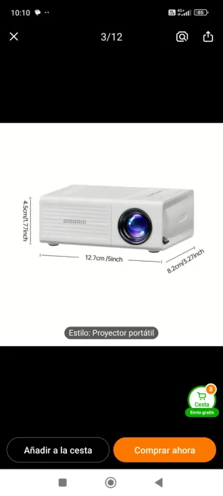 Proyector portátil en color blanco. Sus dimensiones son 12.7cm de largo, 8.2cm de ancho y 4.5cm de alto. - Estilo: Proyector portátil.