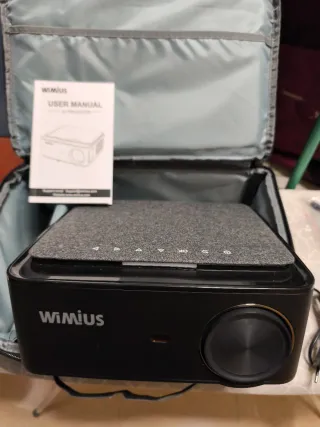 Proyector Wimius FullHD en color negro. - No recomendado para videojuegos (alta latencia) - Funcion de ajuste Keystone para cuadrar la imagen y autofocus. - Resolución FullHD - Diseño compacto. - Incluye caja, bolsa de transporte, cables y kit de limpieza de lente Comprado en marzo de 2024