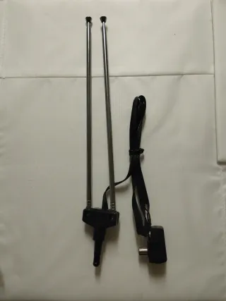 Antena compacta para televisión con cable conector. - Dos varillas metálicas extensibles. - Base negra. - Cable negro con conector. - Diseño discreto.
