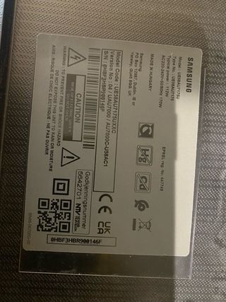 Televisión Samsung de 32 pulgadas de pantalla plana, con soporte, mando, pilas y cables incluidos. Necesita decodificador TDT. La TV tiene una rayón superficial en la parte inferior derecha pero no afecta a la imagen (ver en fotos). El marco no está impecable pero está aceptable.
