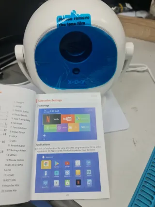 Proyector XOX en colores blanco y azul. Incluye manual de operaciones. - Botones de encendido, mute, avance y retroceso. - Control de enfoque. - Botones de volumen. - Control de rotación y configuración. - Menú principal y control de ratón. - Botón OK y Home. - Botón de retorno y teclas numéricas. - Tecla de borrar.