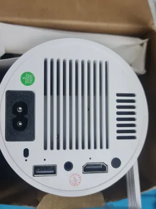 Mini proyector de la marca Jimveo en color gris y blanco. - Diseño compacto y moderno. - Lente frontal. - Rejilla textil en la parte frontal. Solo se ha abierto para probar.funciona perfectamente. Portátil ,se puede poner el cualquier lado,se puede conectar el móvil y otros dispositivos.Se vee bien tanto en pared lisa como en rugosa.