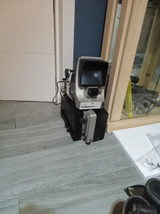 Proyector de película antiguo en tonos plata y negro. Un objeto con un diseño clásico. - Estructura metálica. - Pantalla de visualización. - Lente frontal.