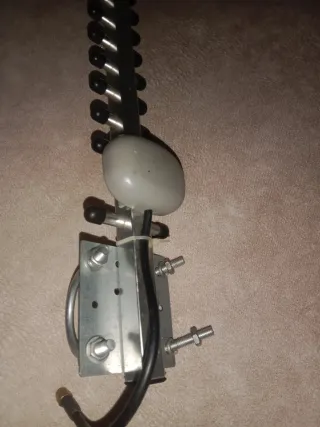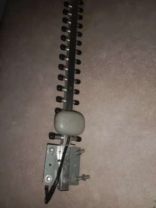 Antena para televisión digital. - Diseño alargado con múltiples elementos. - Soporte metálico para montaje. - Cable de conexión incluido.