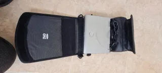 Reproductor de DVD portátil en color plateado. - Pantalla integrada. - Compartimento para disco. - Botones de control. - Altavoces. - Incluye funda de transporte, cable de carga, cable para mechero del coche.
