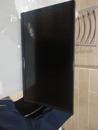 Smart tv Samsung de 40 pulgadas. Diseño moderno en color negro y plateado. Tiene dos puntos blancos que salen en la última foto