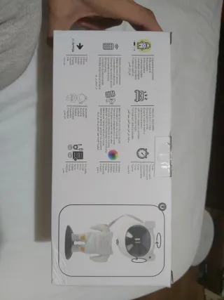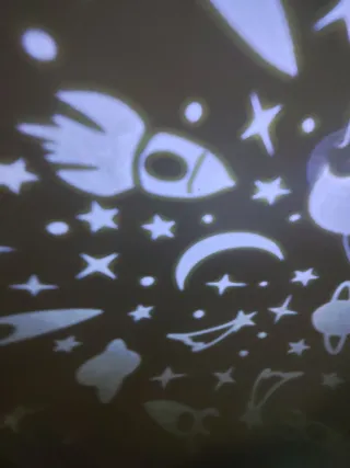 Proyector de estrellas con diseño espacial de Cola Cao. Tiene movimiento de estrellas - Diseño con cohetes, lunas y estrellas. - Base blanca.