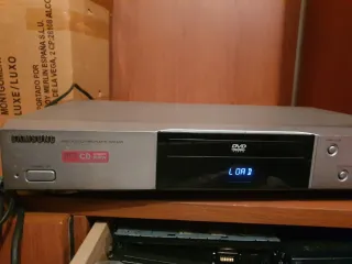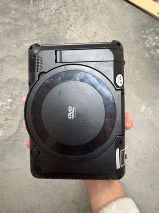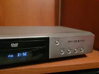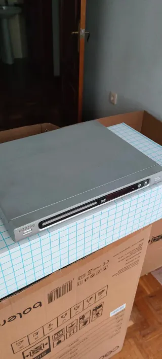 Reproductor de DVD plateado. Desconozco si funciona, aunque encender enciende y extrae la bandeja. Sin mando