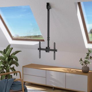 Soporte para anclar al techo televisiones de hasta 50Kg y con sujección VESA de hasta 400x400mm, se puede regular la altura entre 105cm y 155cm, instalar sobre techos en caida con hasta 25º. Perfecto para TV de OLED, QLED, Samsung, TCL, Sony, etc. Marca Hama, muy buena calidad. Hago envíos.