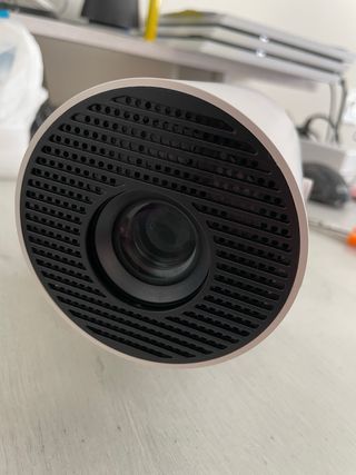 Proyector portátil 4K, Mini proyector de vídeo FHD 1080P Compatible con Android y Netflix, WiFi 6, BT 5.0, rotación de 180°, proyector de vídeo con corrección automática de distorsión Trapezoidal Proyector portátil compacto y moderno, ideal para llevar a cualquier parte. Este dispositivo está completamente nuevo y listo para estrenar. - Diseño cilíndrico elegante. - Soporte integrado para fácil colocación. - Rejilla superior para ventilación.