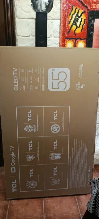Televisor TCL de 55 pulgadas, modelo QLED TV, en su embalaje original. - Pantalla de 55 pulgadas. - Tecnología QLED. - Compatible con Google TV y Google Assistant (Hands-Free Voice Control). - Soporte para HDR y Dolby Vision.