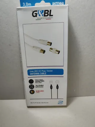 Cable de antena G&BL de 3 metros de longitud. Conector Coax (IEC) 9,5 Plug / Socket. - Incluye adaptador macho/macho. - Impedancia de 75 OHM. - Cable blindado. - Para TV, decodificador TDT, grabador de vídeo.