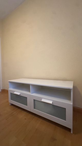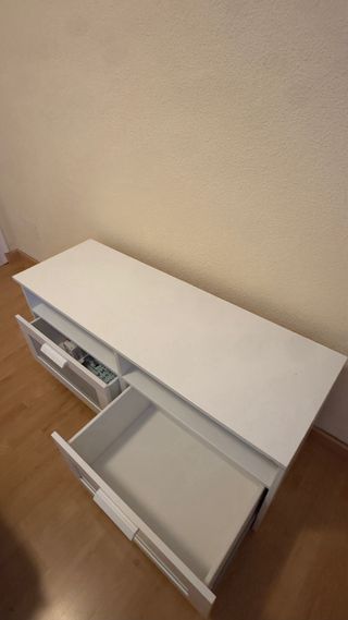 Mesa de centro blanca con diseño moderno y práctico. - Dos compartimentos abiertos superiores. - Dos cajones con puertas de cristal esmerilado y tiradores blancos. Medidas: 120x41x53