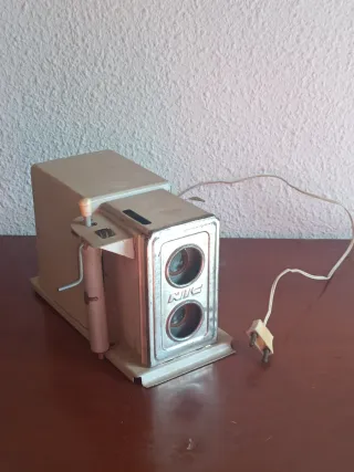 Proyector antiguo de la marca NIC en color beige. Un objeto con un diseño clásico. - Doble lente frontal. - Palanca lateral para avance. - Cable de alimentación incluido.