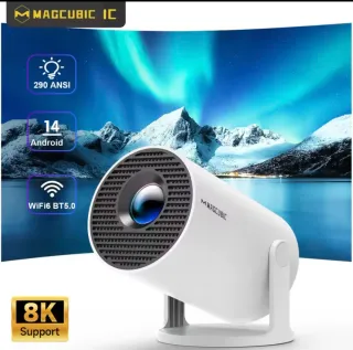 Proyector portátil MAGCUBIC en color blanco, ideal para cine en casa. - Brillo de 290 ANSI. - Sistema operativo Android 14. - Conectividad WiFi 6 y Bluetooth 5.0. - Soporte para resolución 8K.