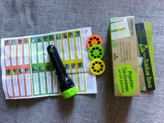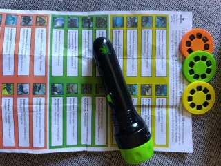 Proyector de bolsillo con 24 motivos de dinosaurios. - Incluye linterna proyector. - 24 imágenes de dinosaurios. - Incluye lista de nombres. - La pilas funcionan.