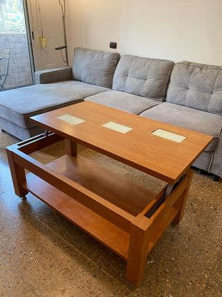 Mesa de centro con diseño moderno y funcional, ideal para tu salón. - Acabado en madera clara. - Superficie con tres insertos de cristal. - Estante inferior adicional. - Patas con ruedas para fácil movilidad. A RECOGER AVENIDA ESCALERITAS N44