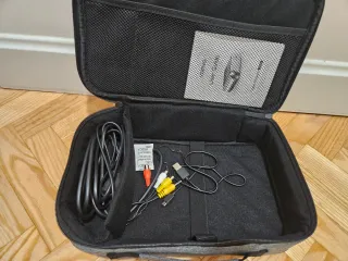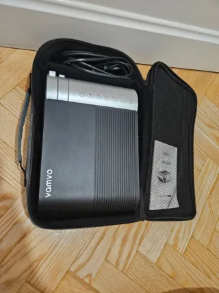 Proyector portátil Vamvo en colores negro y plateado, ideal para llevar contigo. Incluye su funda de transporte. - Diseño compacto y ligero. - Funda protectora con cremallera. - Cable de alimentación incluido.