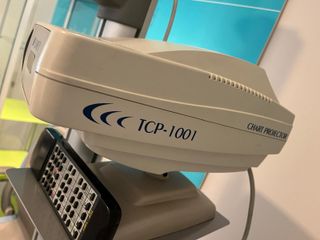 Proyector de optotipos Tomey TCP-1001. - Incluye mando a distancia y pantalla de proyección. - Diseño compacto y moderno.