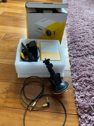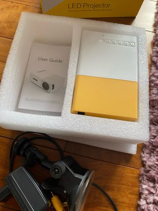 Mini proyector LED portátil con un diseño moderno en blanco y amarillo. - Incluye cables de conexión AV y un soporte. - Adaptador de corriente incluido. - Mando a distancia. - Se regala jack y soporte con ventosa