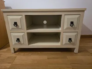 Mesa de centro o mueble de televisión con un diseño práctico y elegante. - Acabado en color beige. - Cuatro cajones con tiradores negros. - Dos huecos centrales para dispositivos.