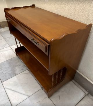 Mesa auxiliar de madera con un diseño clásico y elegante. Ideal para colocar junto a un sofá o como mueble auxiliar. - Acabado en madera de cerezo. - Un cajón con tirador metálico. - Dos baldas inferiores para almacenamiento. - Patas torneadas y detalles decorativos.