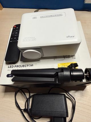 Proyector LED compacto y portátil. Se ha usado 2 veces, esta nuevo. - Incluye mando a distancia. - Incluye trípode. - Incluye adaptador de corriente. -Incluye cable HDMI