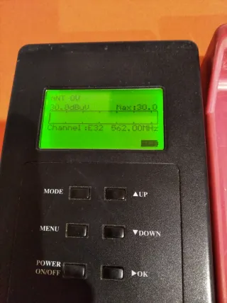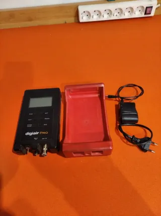 Medidor de señal de TV marca Digiair, modelo Pro. Incluye su funda protectora roja y cargador. - Pantalla LCD. - Botones de control: MODE, MENU, POWER ON/OFF, UP, DOWN, OK. - Conexiones: DC IN 12V, ANT IN. - Funda protectora de color rojo. - Cargador de corriente. Se incluye tambien movhila negra. Para cargarlo hay que poner el interruptor a la derecha y para funcionar a la izd. Lleva una bateria recargable de 12v 6500mA.