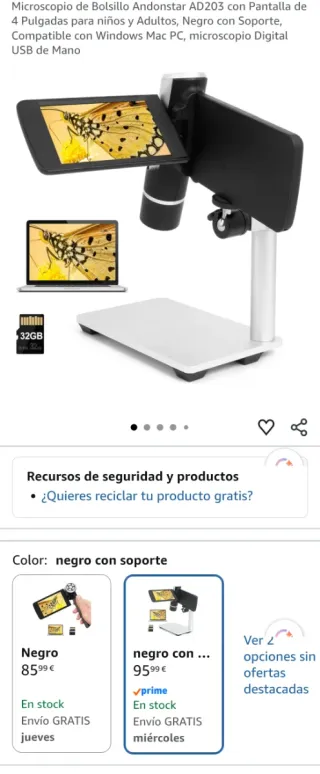 Microscopio digital de bolsillo Andonstar AD203 con pantalla de 4 pulgadas. Compatible con Windows y Mac. - Incluye soporte y tarjeta de 32GB. - Peso: 200 gramos - Batería de litio recargable de 1800 mAh 25X: Lente de microscopio original 80X: después del zoom digital (presione la tecla hacia arriba para acercar 3 veces) 200X: cuando está conectado a una pantalla de computadora de aproximadamente 30 pulgadas