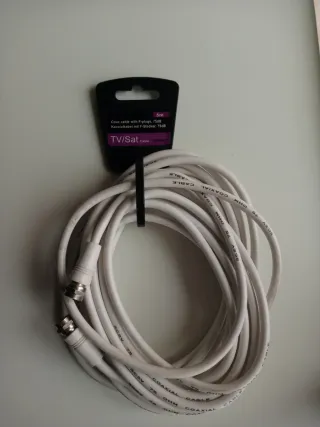 Cable coaxial blanco para TV y Satélite. Nuevo, sin usar. - Longitud de 5 metros. - Conectores tipo F (F-plugs). - Blindaje de 75dB.
