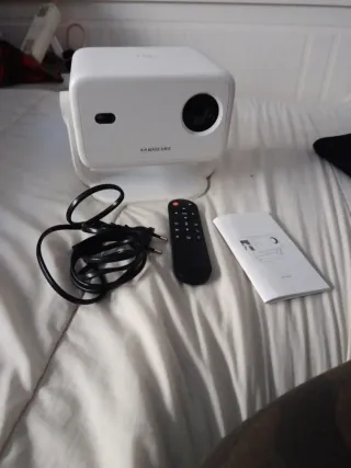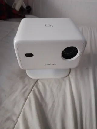 Proyector MAGCUBIC L018 en color blanco. 650 ANSI Lúmenes. Android 11. Incluye mando a distancia y manual. Lo vendo por cambio a televisor. Las manchas que se ven en la imagen se pueden limpiar. La ranura que hay que abrir para limpiar la lente no se abre, el tornillo no sale. Quizás tú puedas abrirlo. Hay que limpiar la lente con bastoncillo o aireador para quitar el polvo. El proyector en si funciona bien. - Diseño compacto y moderno. - Soporte integrado para ajuste de ángulo.
