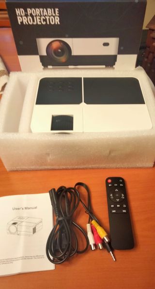 Mini proyector portátil con conectividad WiFi. - Resolución 720P. - Diseño compacto y ligero. - Puede proyectar en tanto normal con invertido e incluso en el techo. Compatibilidad con android e IOS duplicando pantalla. También puedes ver con cualquier usb de películas y por HDMI cualquier dispositivo. Sonido incorporado con posibilidad de conectar altavoces externos. Regalo mini tripode para mejorar sujeción y dar algo de altura. Perfecto estado es todos los aspectos. No rebajo precio. Se entrega en Mostoles