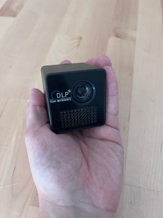 Proyector LED portátil en color blanco. - Diseño compacto y ligero. - Panel de control integrado en la parte superior. - Entrada para cable de alimentación.sin mando