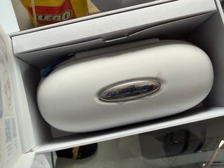 Proyector portátil con funciones de Smart TV. Diseño moderno y elegante. - Color beige y blanco. - Asa superior para fácil transporte. - Lente frontal circular.