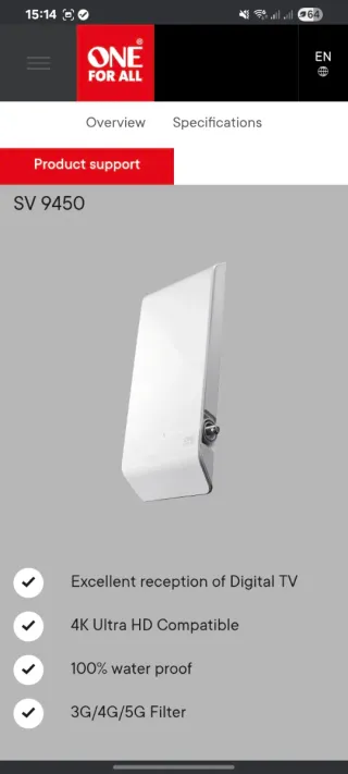 Antena de TV para exteriores modelo SV9450R03. - Diseño compacto y discreto. - Cables incluidos. - Soporta 4K. Negociable