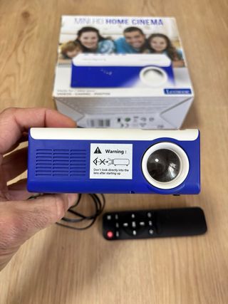Mini proyector HD para disfrutar de vídeos, juegos y fotos. Incluye mando a distancia y adaptador de corriente. - Diseño compacto en color blanco y azul. - Ideal para crear una experiencia de cine en casa.