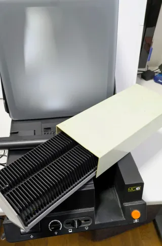 Proyector de diapositivas automático con enfoque automático. - Apto para cargadores CS, LKM y universales. - Incluye monitor incorporado para visualización directa. - Sistema Agfa CS.