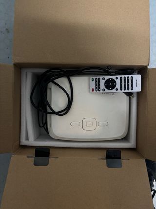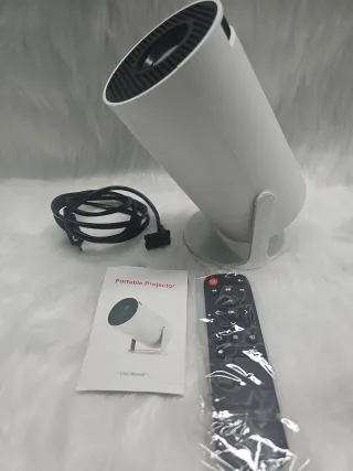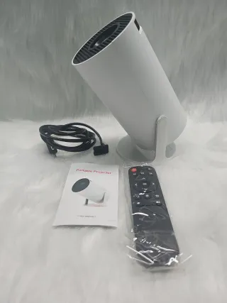Proyector en color blanco. - Diseño moderno y compacto. - Ideal para presentaciones o cine en casa. - Se vende con trípode, maletín de transporte, cable HDMI y kit de limpieza. También tiene mando a distancia.