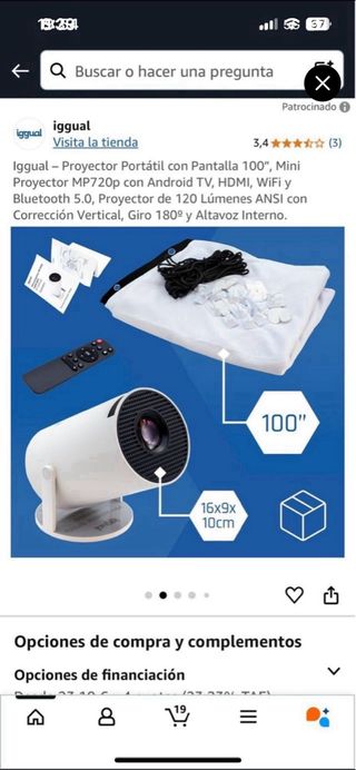 1920x1080p Full HD nativo. Soporta 4k. Enfoque + Corrección Trapezoidal Automático. Proyección frontal, lateral o de techo 50-300 pulgadas (1,5-7 m). Brillo: 26000. Contraste: 36000:1. WiFi-6 y Bluetooth 5.2. Conecta teléfono, Tablet, PC, auriculares, altavoces. Zoom Digital: 100%-50%. Vida Lámpara LED: 150000H. Lee archivos en pendrive. 16,8m color. Entradas: HDMI x2, VGA, AV, USB x2. Incluye: Cables + Cubierta de lente + Mando + Mochila. Nuevo. No reproduce videos de Netflix o Amazon Prime a través del móvil, pero sí desde TV/PC. No compatible con - Conectividad WiFi y Bluetooth. - Resolución FullHD. - Incluye bolsa de transporte.