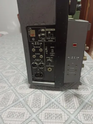 Proyector GS800. - Panel de control con selector de grabación (Normal, Doble, Slow Quick, Fading). - Entradas y salidas de audio (Aux Out, Mono, Stereo, Ext Sp). - Conector de alimentación. - Selector de velocidad de ajustes