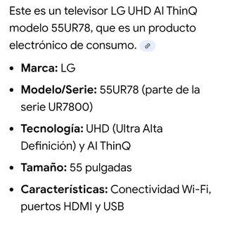 Televisor LG de 55 pulgadas con sistema webOS. Se encuentra en muy buen estado. - Pantalla de 55 pulgadas. - Sistema operativo webOS. Sin control remoto.