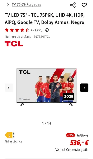 Televisor inteligente de gran formato. - Pantalla de 75 pulgadas. - Diseño moderno y elegante. El motivo de venderlo es por que a la vivienda que nos emos mudsdo es demasiado grande, tiene 1 año y me costo 700€ ahora esta en mediamartk a 536€ solo falta mando que en la mudanza se a perdido