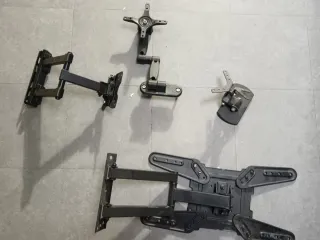 Conjunto de soportes para TV, incluyendo un brazo articulado y otros soportes de pared. - Brazo articulado para TV. - Soporte de pared. - Piezas metálicas de color negro. Se venden los 4