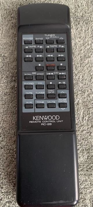 Mando a distancia Kenwood RC-28. - Óptimo estado funcional/estetico - Botones de control de volumen. - Botones de cinta A y B. - Botones de CD y Tuner. - Botones de Phono y Aux. - Mide: 18x5x1,5 cm.