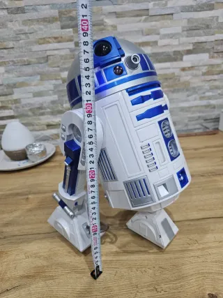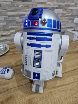 Figura interactiva de R2D2 con control por voz y mando a distancia,proyecta imagen de leía en la pared,se le puede programar acciones,funciona a distancia vía voz o mando,luces,movimientos de cuerpo diversos, voces,funciona a pilas,gran tamaño,muy detallado. - Control por voz. - Mando a distancia incluido. - Diseño detallado del personaje.