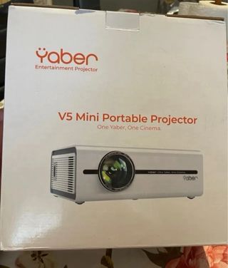 Proyector Yaber V5 en color blanco y gris, ideal para entretenimiento en casa. Incluye trípode y maletín de transporte