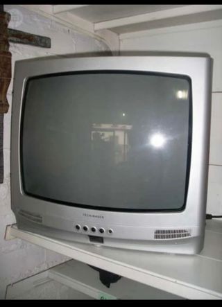 Televisión TECHNIMAGEN en color gris plata. Está en buenas condiciones. Sin mando - Modelo antiguo. - Pantalla de tubo.